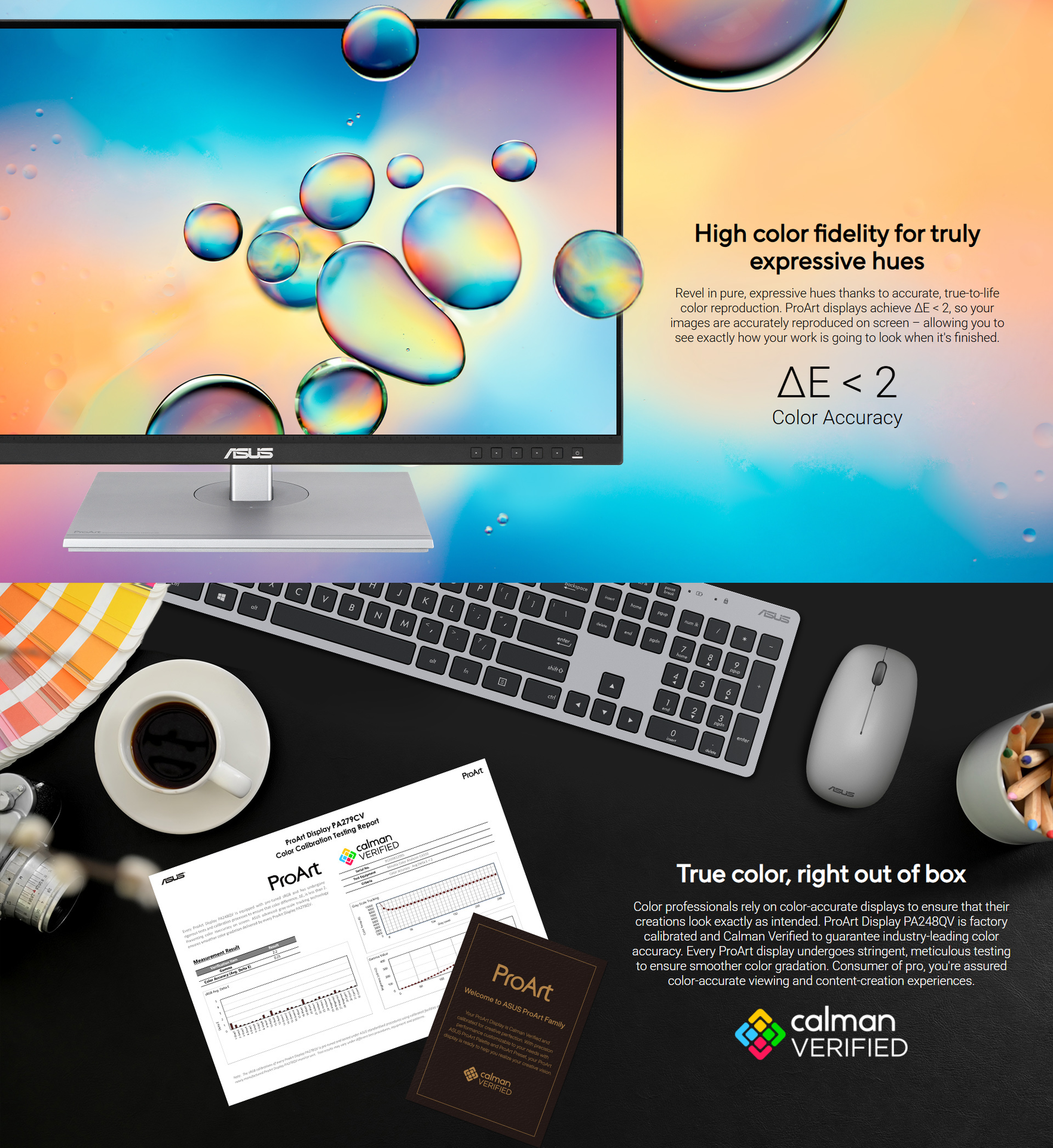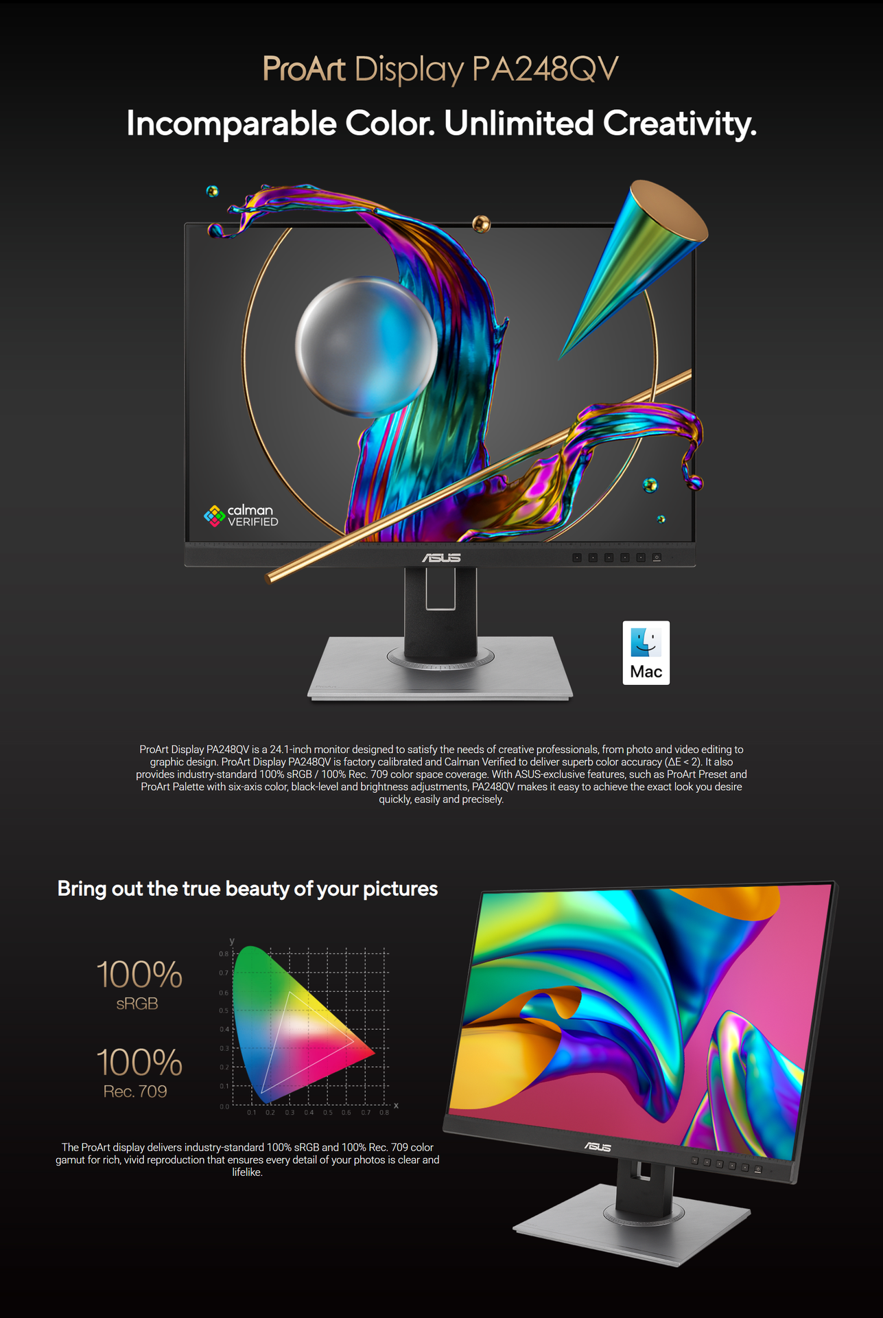 Designed for color-critical work, every PA248QV is factory pre-calibrated and Calman Verified to ensure an industry-leading color accuracy of Delta E < 2. With 100% sRGB and 100% Rec. 709 color space coverage, your work will appear exactly as you intended, whether you are preparing photos for print or videos for web playback.
