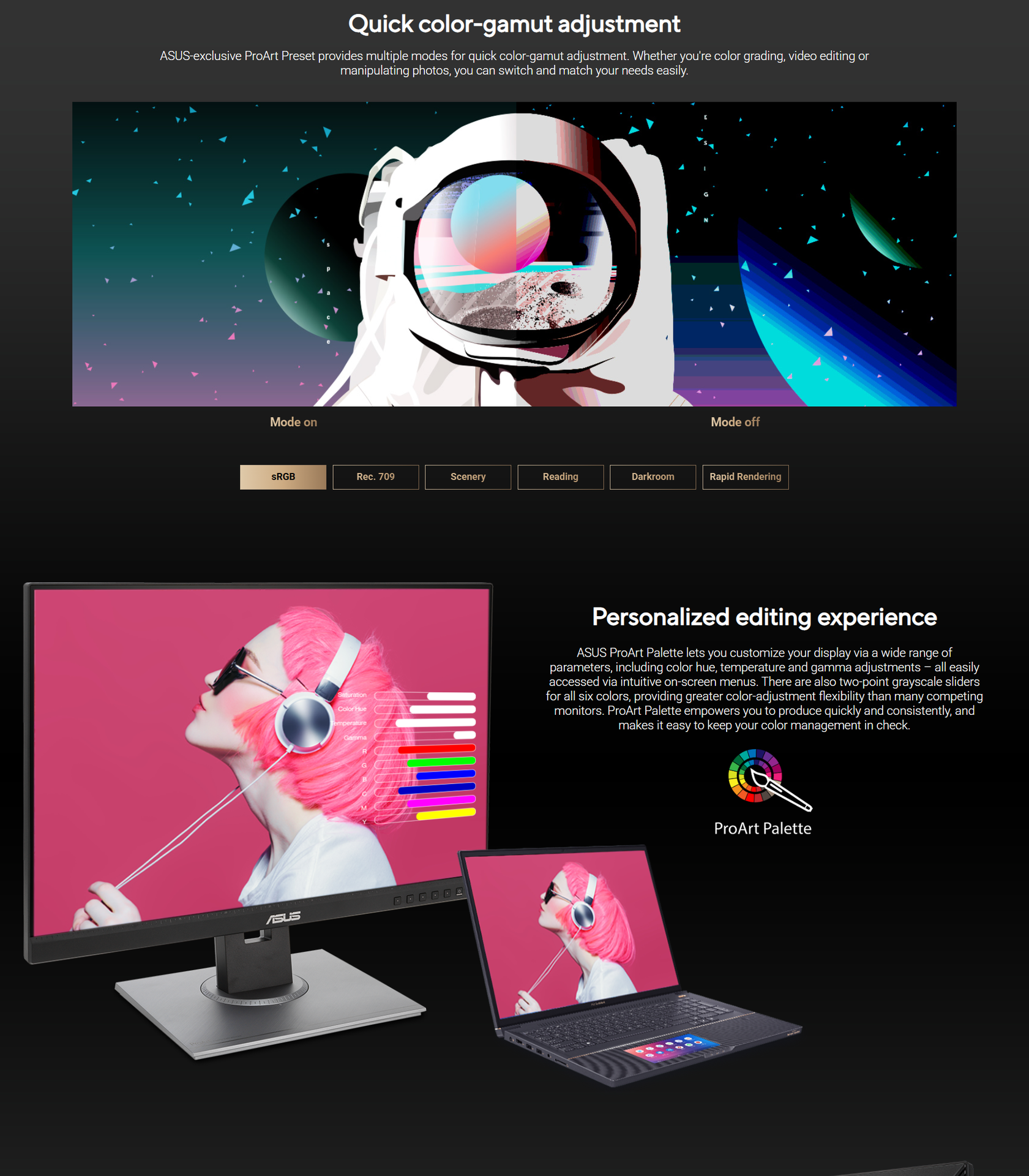 ASUS’s exclusive ProArt Preset and ProArt Palette give you complete control over your viewing experience. Whether you need to switch between color gamuts, adjust 6-axis color settings, or refine gamma levels (1.8 to 2.6), this monitor adapts to your specific workflow. With 75Hz refresh rate and Adaptive-Sync, animations and fast-paced actions are smooth and free of tearing, ensuring a comfortable experience even during long editing sessions.