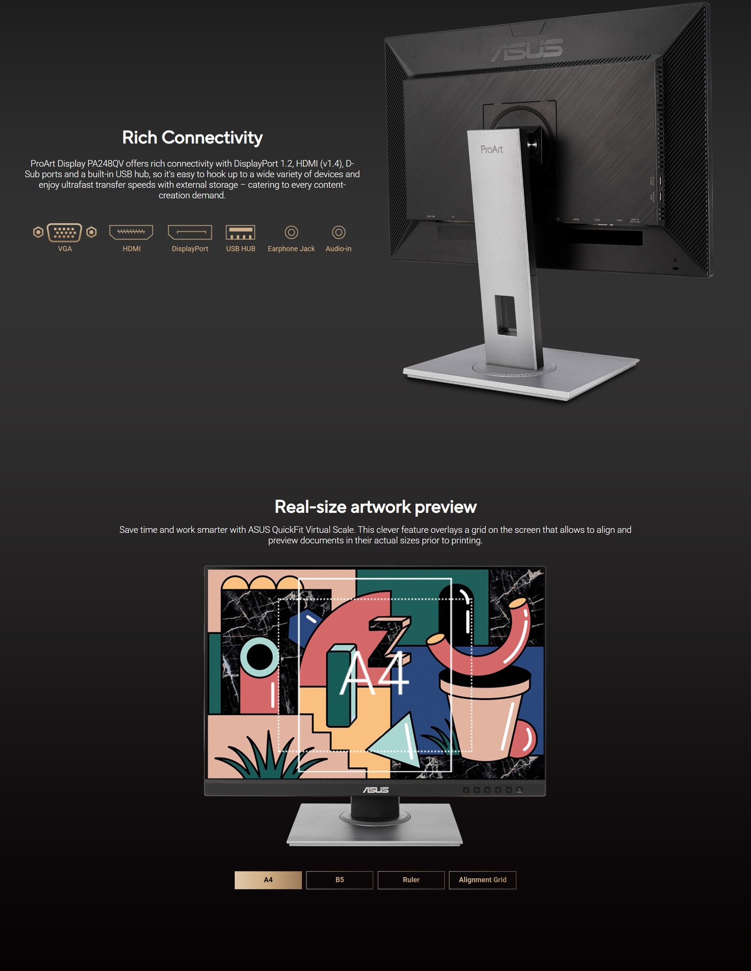 The ASUS ProArt Display PA248QV offers a 24.1-inch IPS panel with a WUXGA (1920 x 1200) resolution. By providing a 16:10 aspect ratio, this monitor offers more vertical screen real estate, which is invaluable for creative professionals who need to see more of their toolbars, document pages, or photo-editing interfaces without constant scrolling.