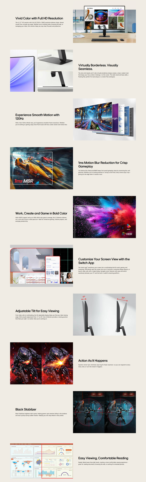 Experience smoother visuals and faster performance with the LG 27U411A-B, a 27-inch Full HD IPS monitor built for both work and play. With a 120Hz refresh rate and 1ms Motion Blur Reduction (MBR), it delivers ultra-smooth gameplay and crisp motion clarity.